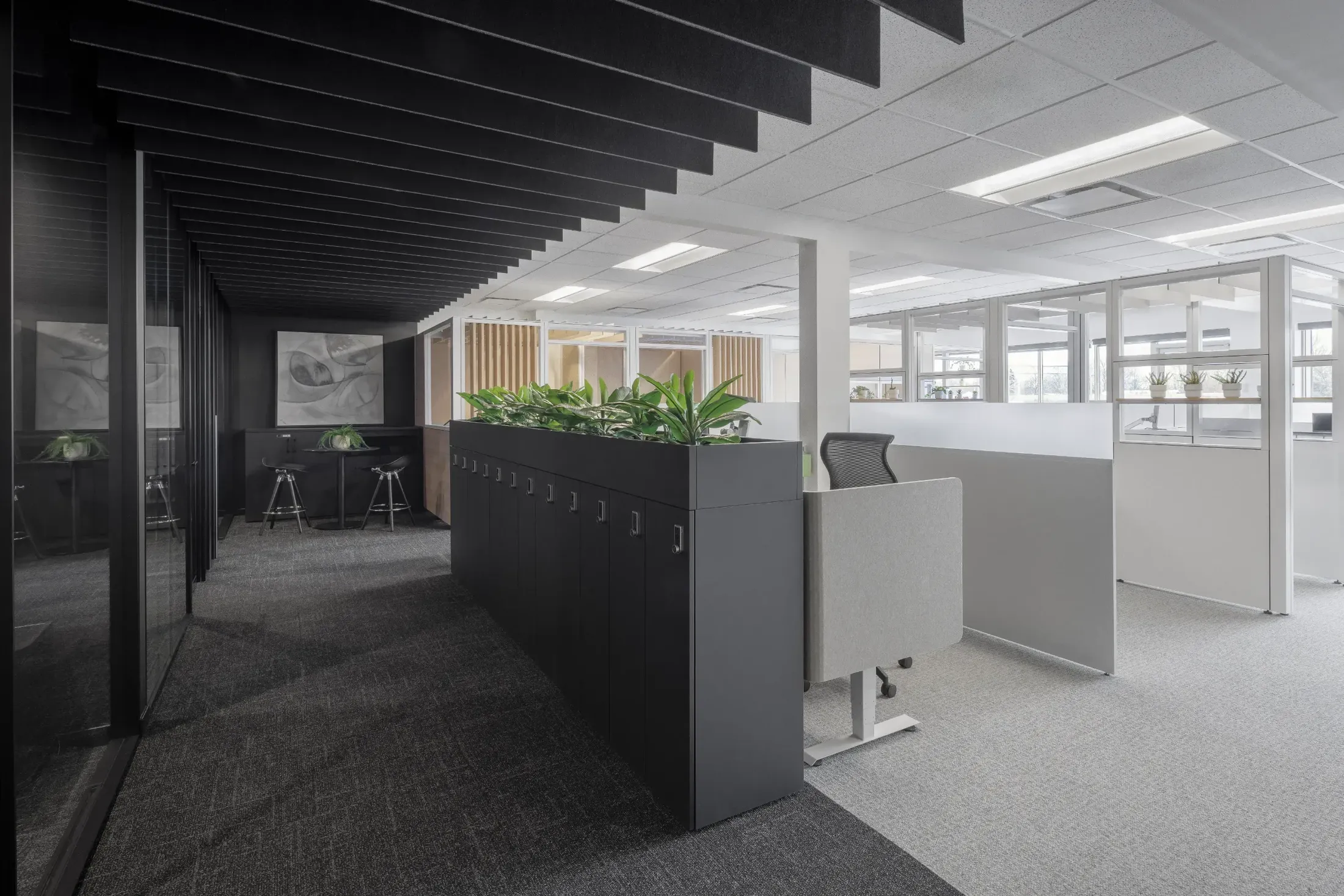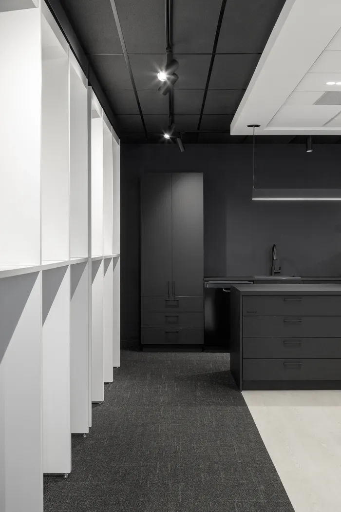 The design approach favors a refined and controlled formal language. Surfaces are clean, lines deliberate, details carefully considered. A restrained palette of black and white, punctuated by bold contrasts, creates a graphic tension that organizes the open floor plan without breaking it into fragments. Black, used as an anchoring element, gives the space contemporary elegance and visual depth, enhancing its volumes. This chromatic strategy defines distinct zones within a vast open floor, without relying on opaque partitions. The space breathes yet remains composed.