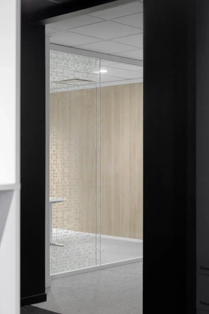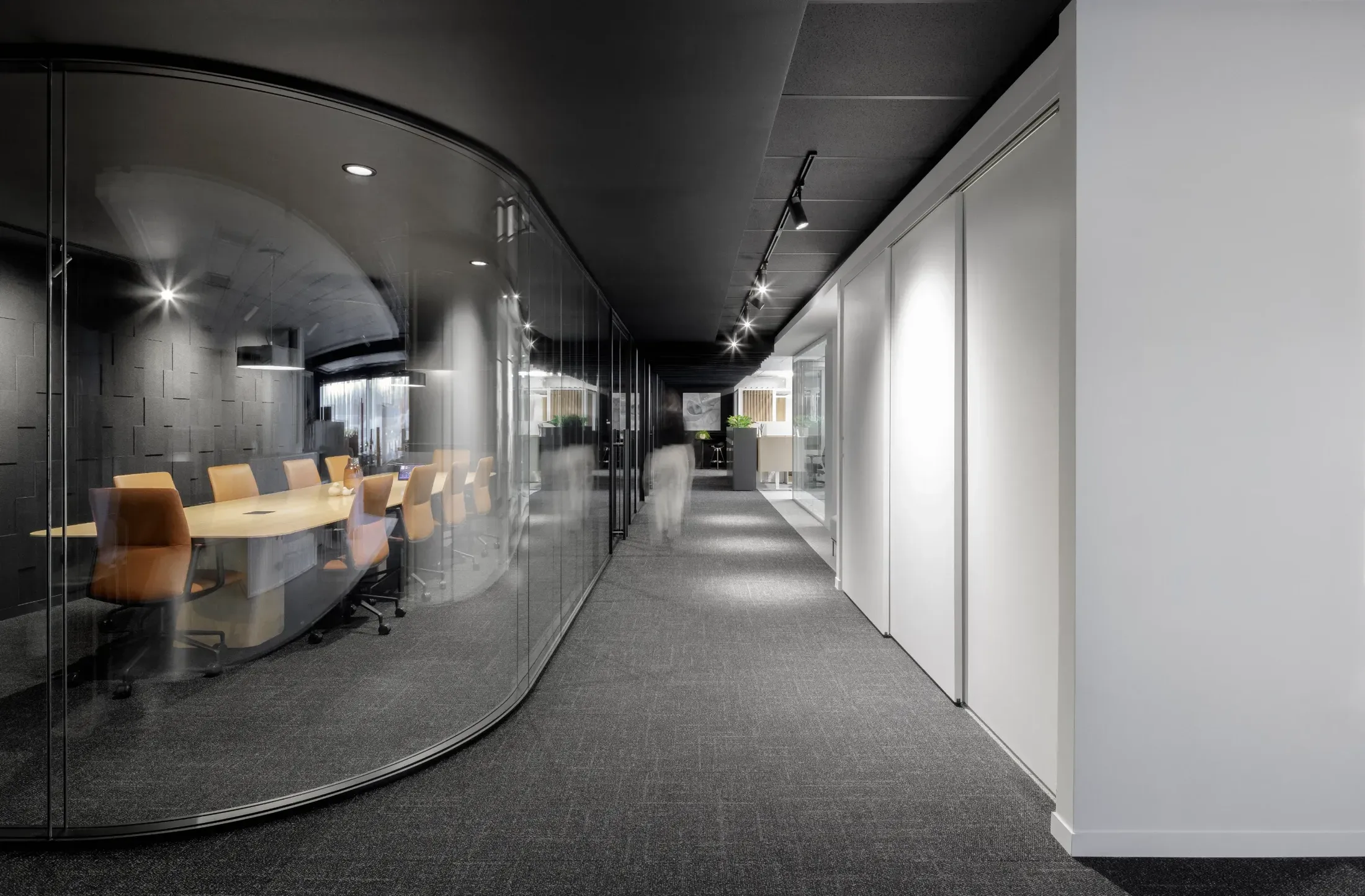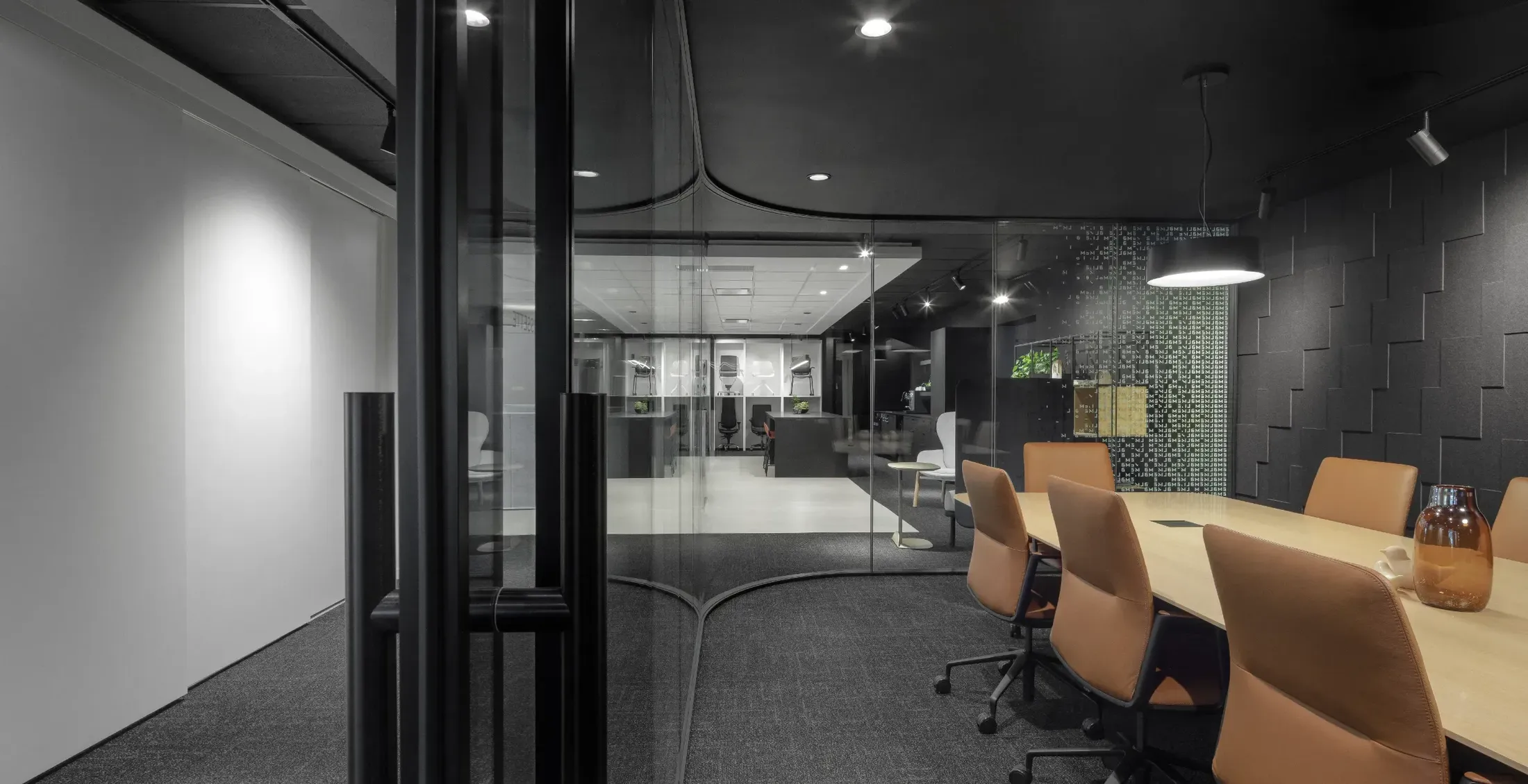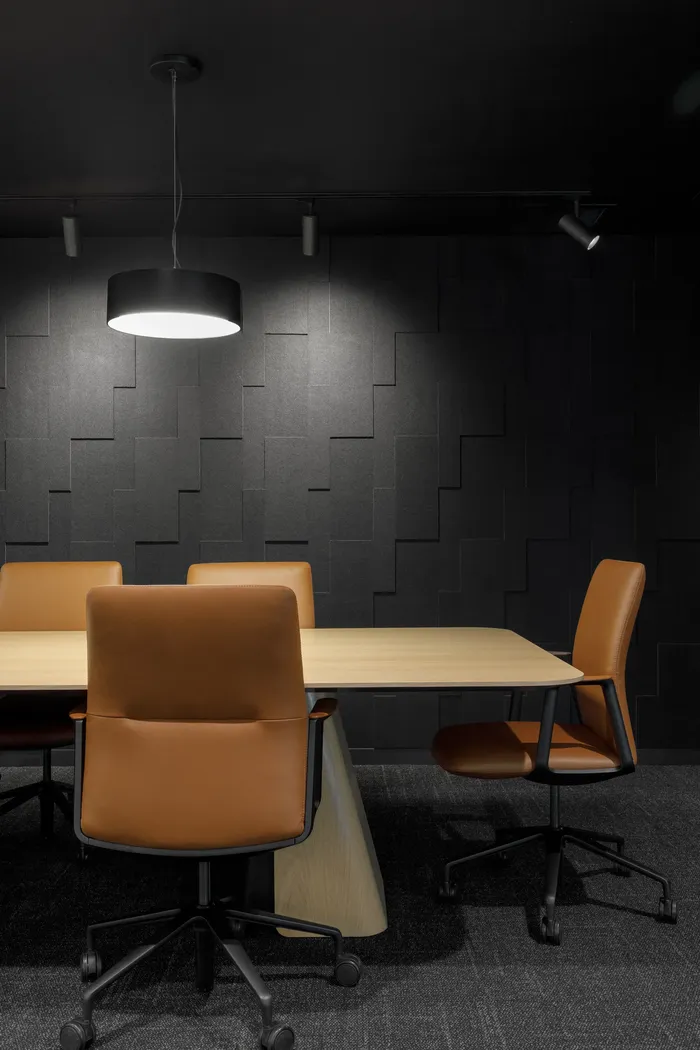 The conference room, in contrast, emphasizes a more enveloping materiality. Wood, felt, and leather furnishings create a richer, almost tactile atmosphere that subtly contrasts with the sobriety of the open areas. Its curved glass wall serves as a focal point, anchoring both circulation and social interaction.