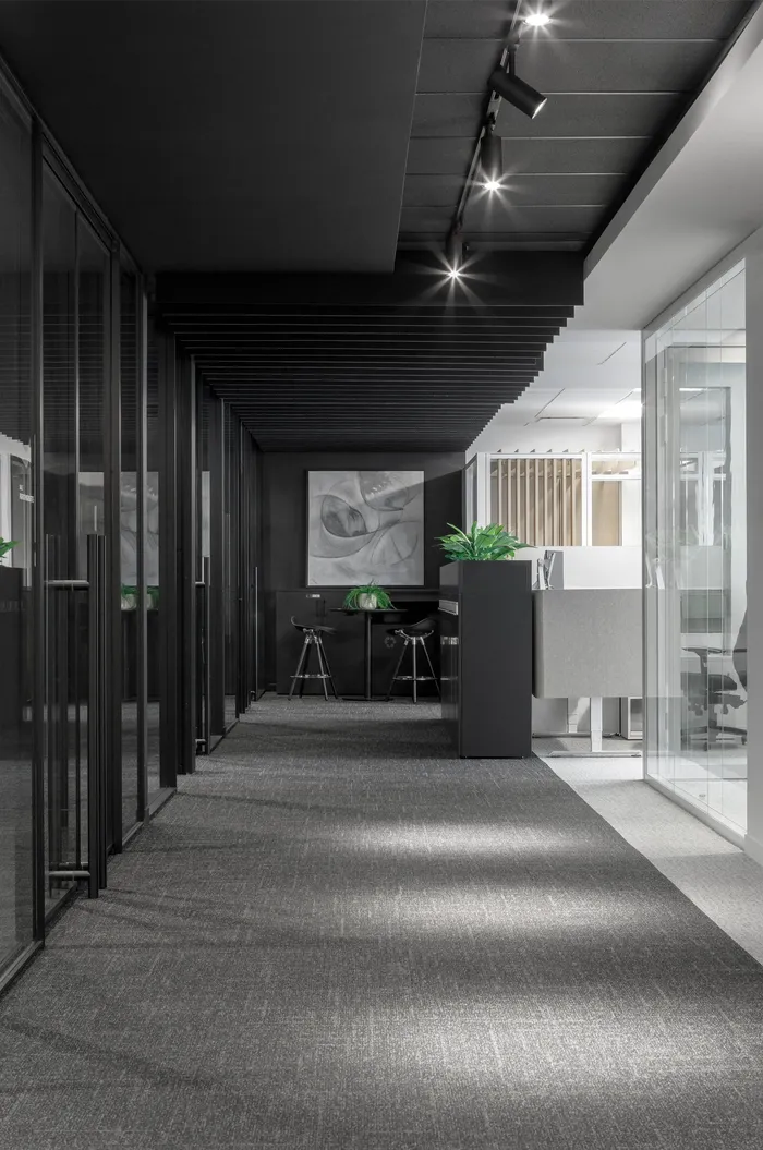 Diversity in work typologies forms another key focus. Open workstations, collaborative areas, and enclosed offices coexist in a fluid layout, demonstrating different professional configurations. The enclosed offices, largely glazed, highlight the architectural partition systems while maintaining transparency and natural light. Glass here plays a strategic role: it exposes the construction technology while preserving a sense of openness and visual continuity.