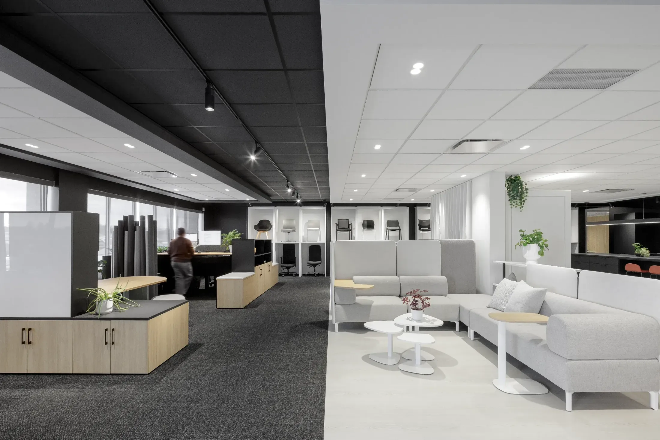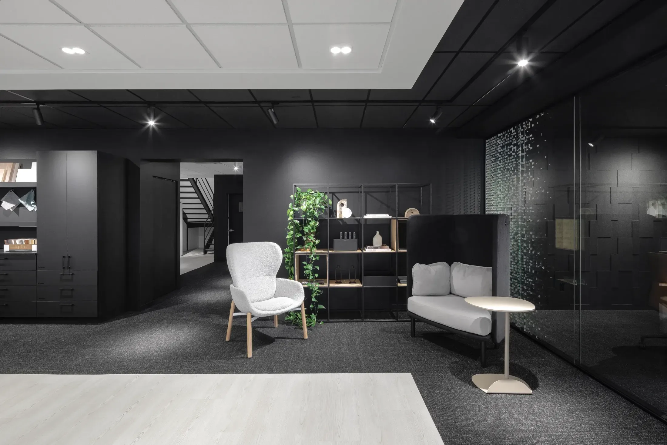 Circulation and flow were central to the design. In a showroom context, the pathway itself becomes a narrative. Axes were clarified to orchestrate an intuitive experience, where each movement naturally leads to a new setup. Close collaboration with the EMBLM team and their suppliers ensured that furniture and partition solutions were presented coherently, integrated into believable environments rather than isolated displays. Each area becomes a living demonstration of a workspace typology, illustrating the versatility of the systems on offer.
