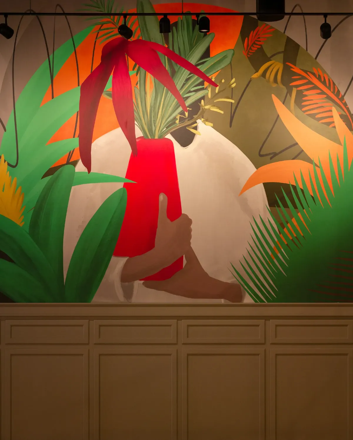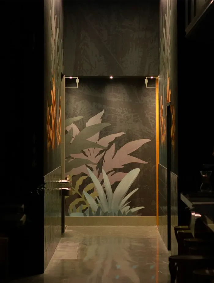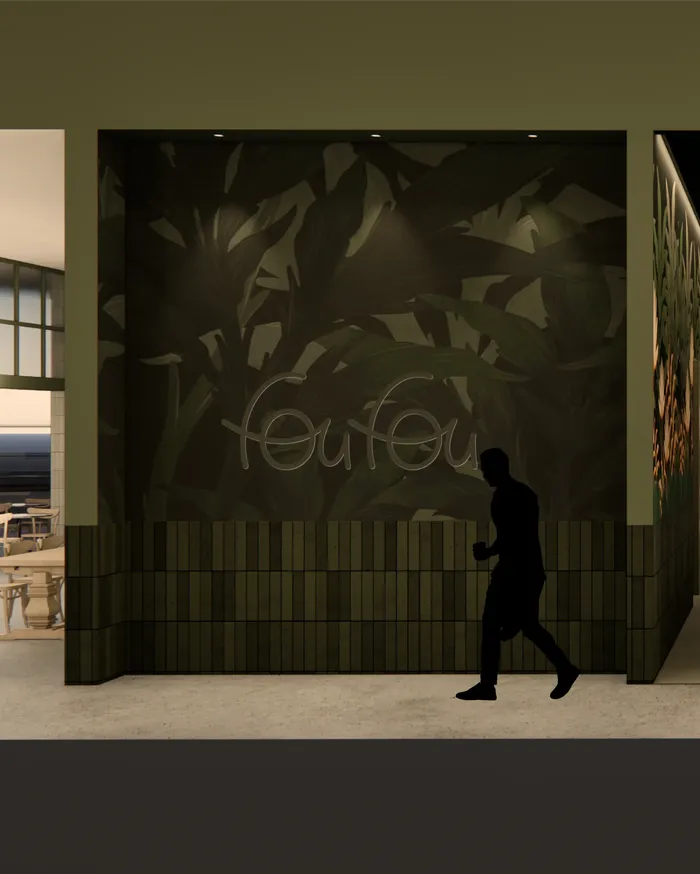 The project’s visual direction, titled Wild Things, served as the creative backbone for the mural. This identity embraces an immersive universe that is rich in detail, organic in form, and striking in contrast. Inspired by the jungle, surrealism, and the interplay of light and shadow, the mural incorporates bold graphic elements, lush botanical motifs, and layered textures. While not a literal reproduction of the brand, it embodies its visual language and firmly anchors Le Fou Fou’s identity within the physical space.