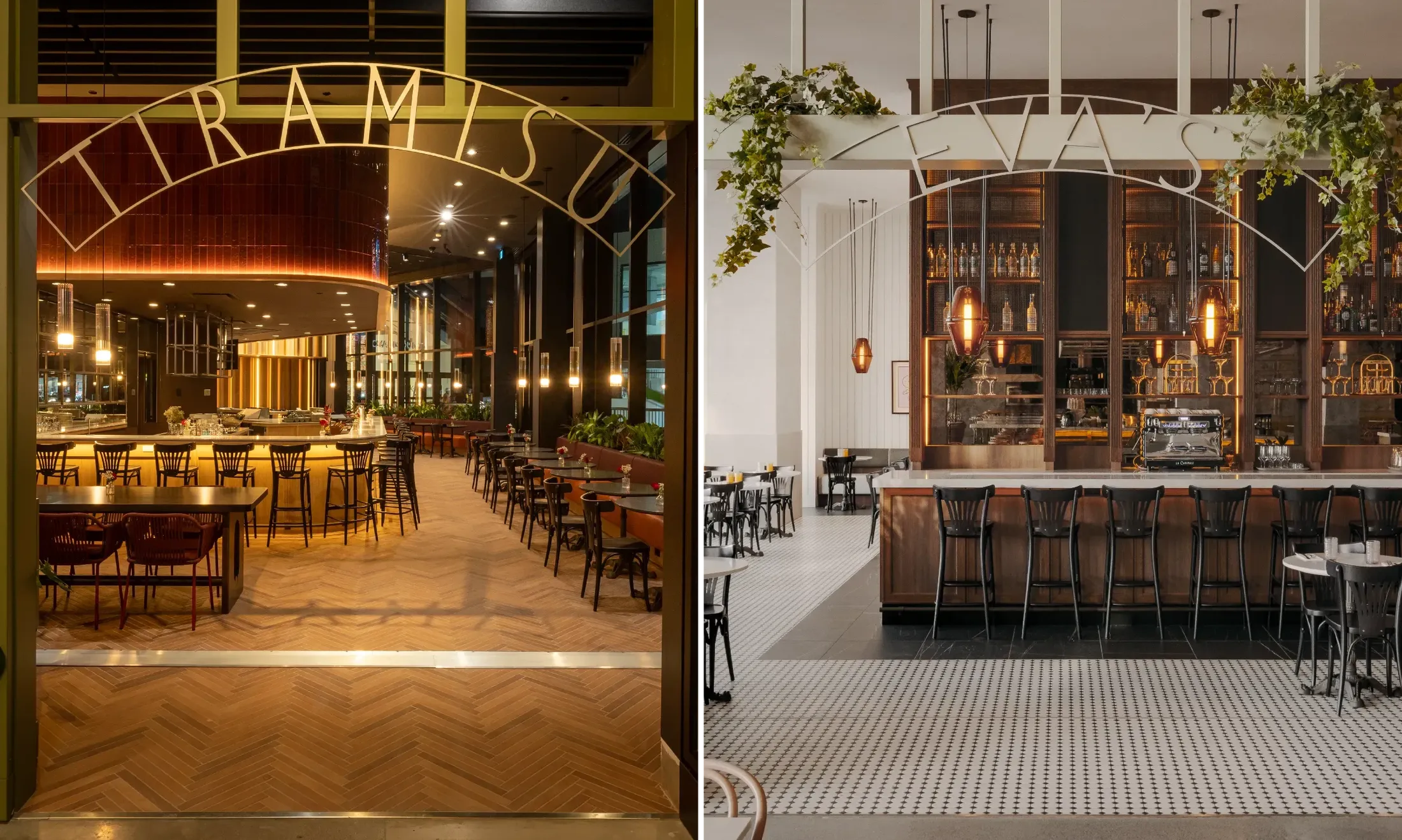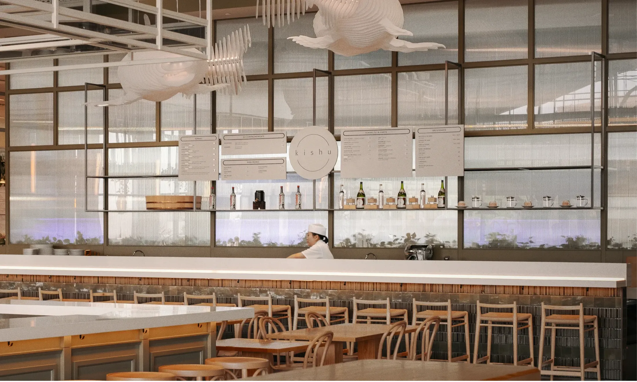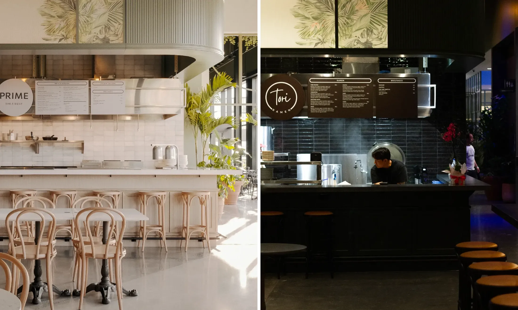 In line with the interior design concept, the signage draws inspiration from French bistro culture and the early 20th-century European artistic aesthetic. The signs are the result of a stylistic exploration that borders on decorative art. Beyond directional signage that guides visitors to key amenities, the heart of the project focused on the creation of restaurant signs that dominate the space. The front-facing kiosk signage evokes classic theater marquees, displaying the name of each kiosk along with a glimpse of its offerings. Playfully referencing the Roaring Twenties and Parisian arcades, perpendicular retro-contemporary signs proudly showcase tenant logos, enhancing the venue’s expressive and immersive character.