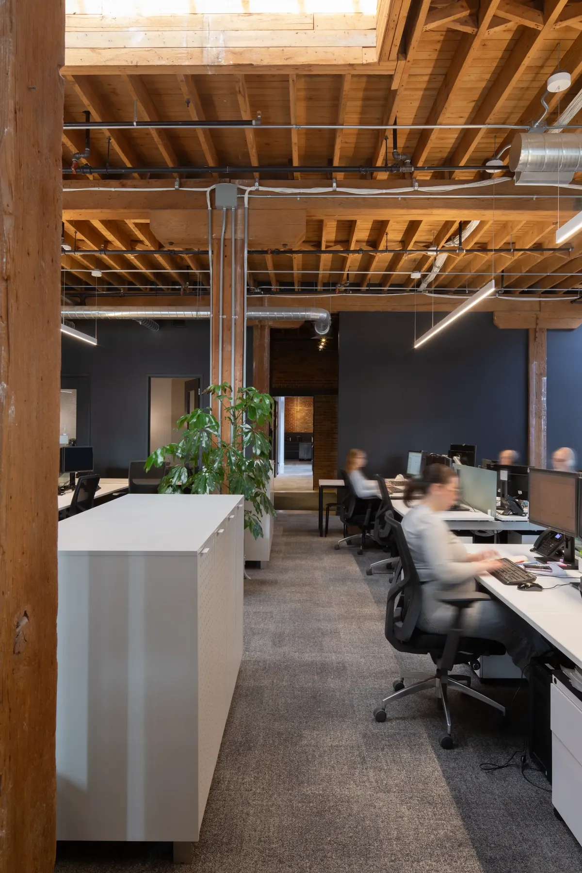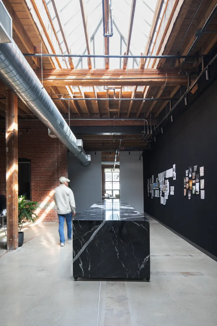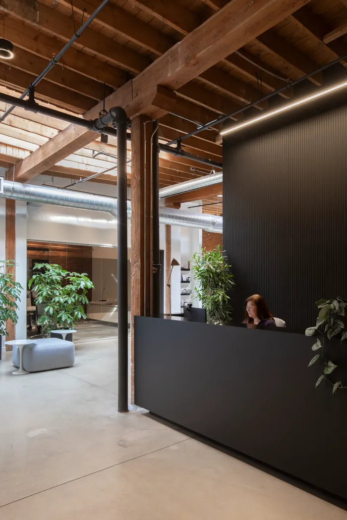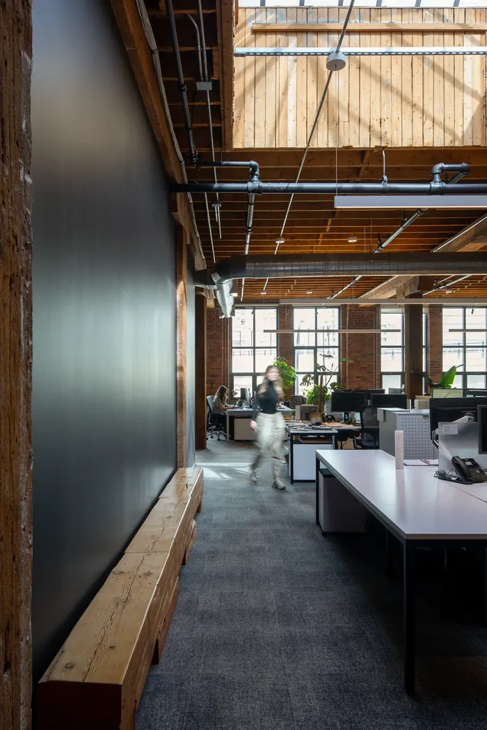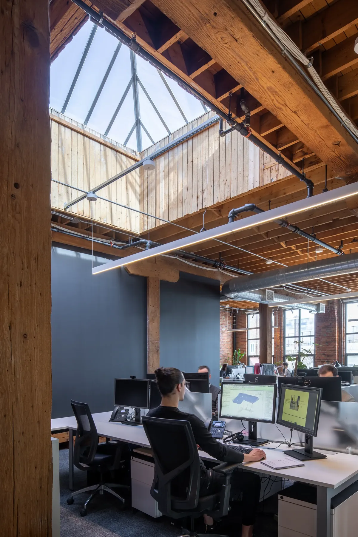 Le noyau central regroupe les espaces fermés et les locaux techniques, dont les murs peints en noir mettent en valeur la structure de bois d’origine. L’atelier, quant à lui, demeure ouvert, permettant un aménagement des postes de travail en grappes qui génèrent des sous-zones dynamiques et favorisent une circulation fluide. Enfin, des éléments graphiques, notamment sur la cloison vitrée de la réception, viennent renforcer l’identité visuelle de la firme.