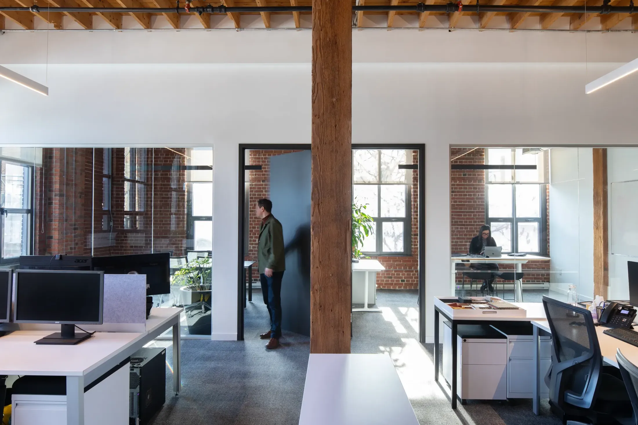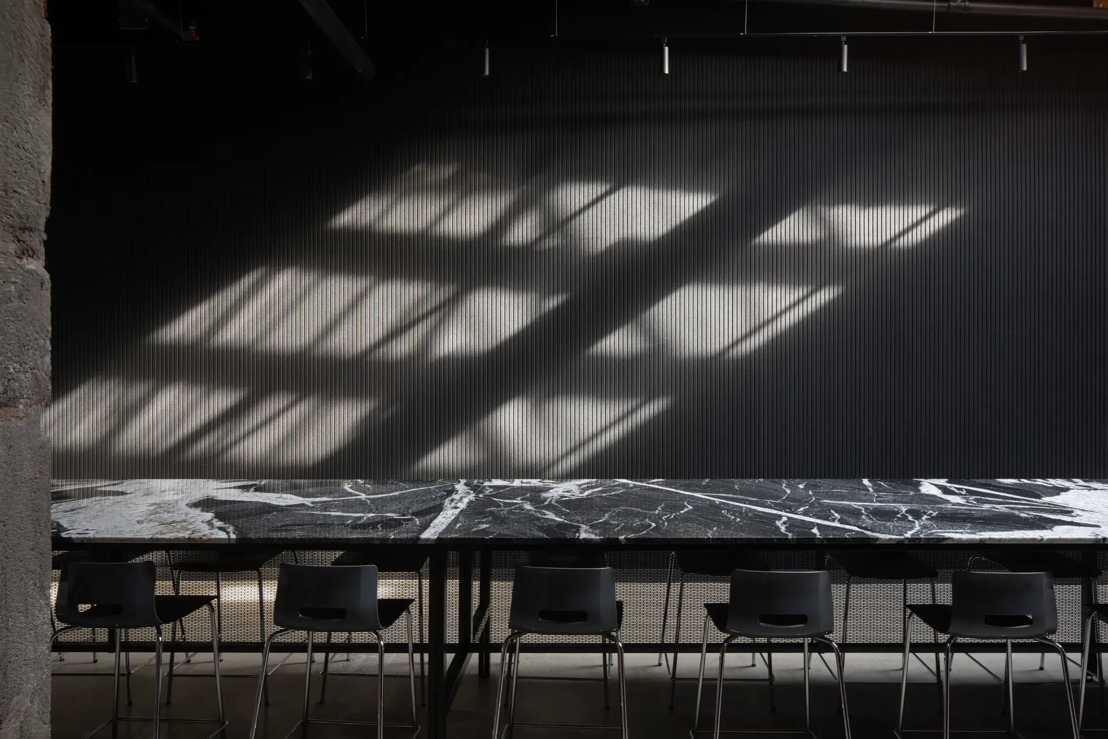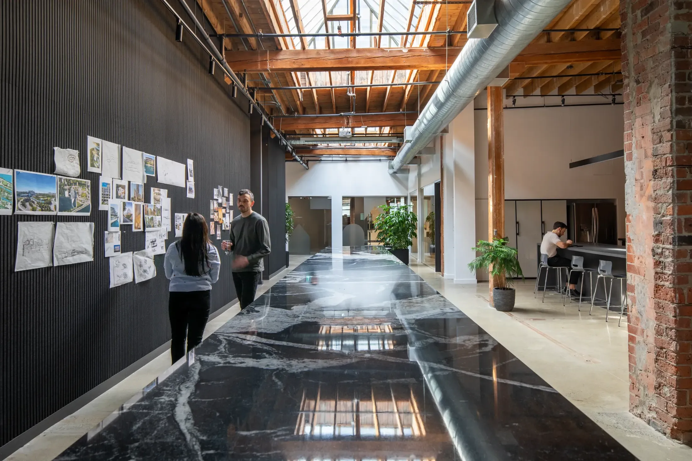 Le noyau central regroupe les espaces fermés et les locaux techniques, dont les murs peints en noir mettent en valeur la structure de bois d’origine. L’atelier, quant à lui, demeure ouvert, permettant un aménagement des postes de travail en grappes qui génèrent des sous-zones dynamiques et favorisent une circulation fluide. Enfin, des éléments graphiques, notamment sur la cloison vitrée de la réception, viennent renforcer l’identité visuelle de la firme.
