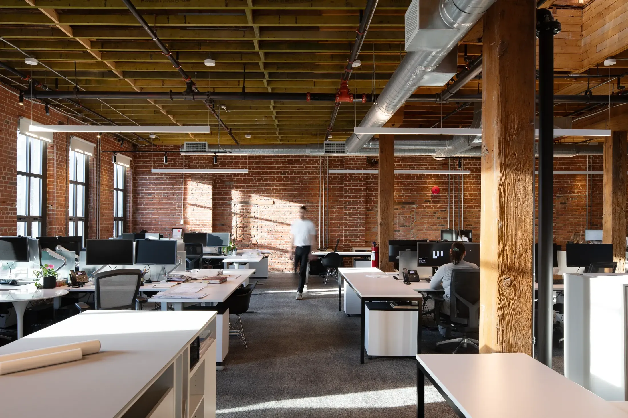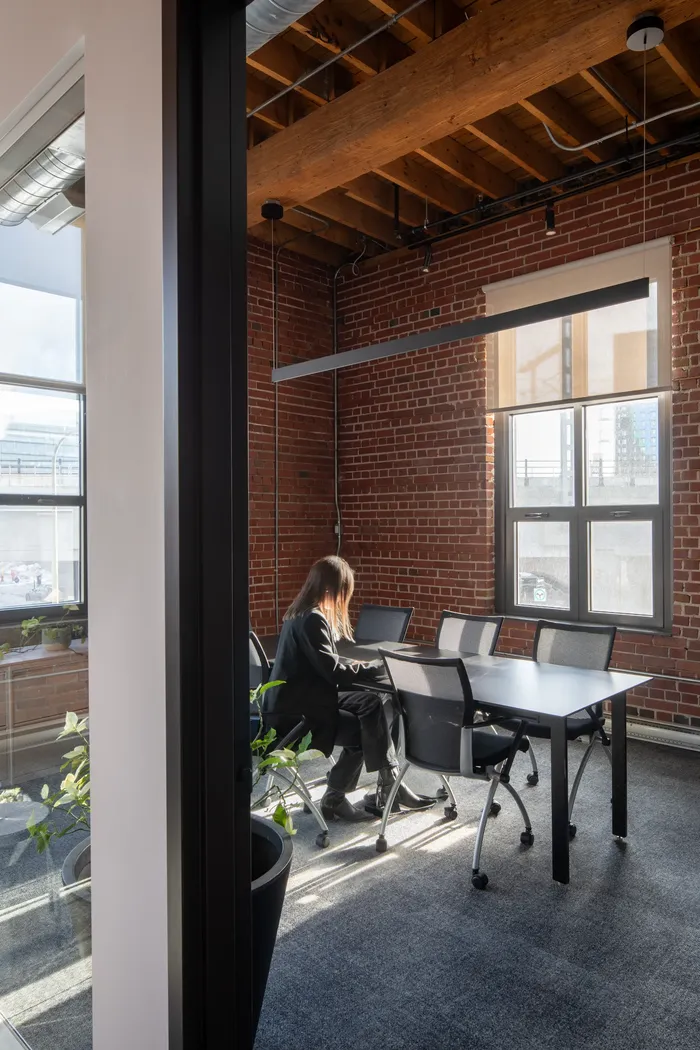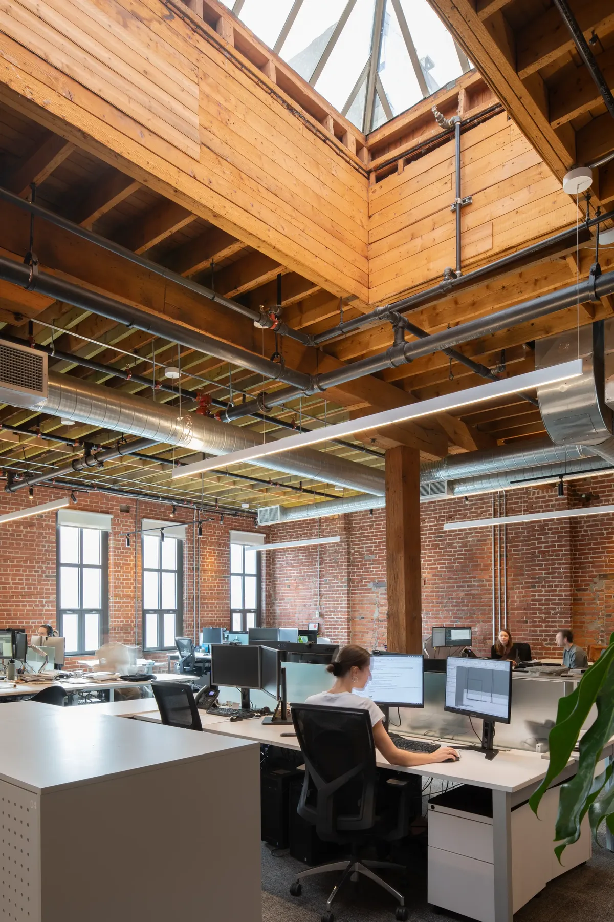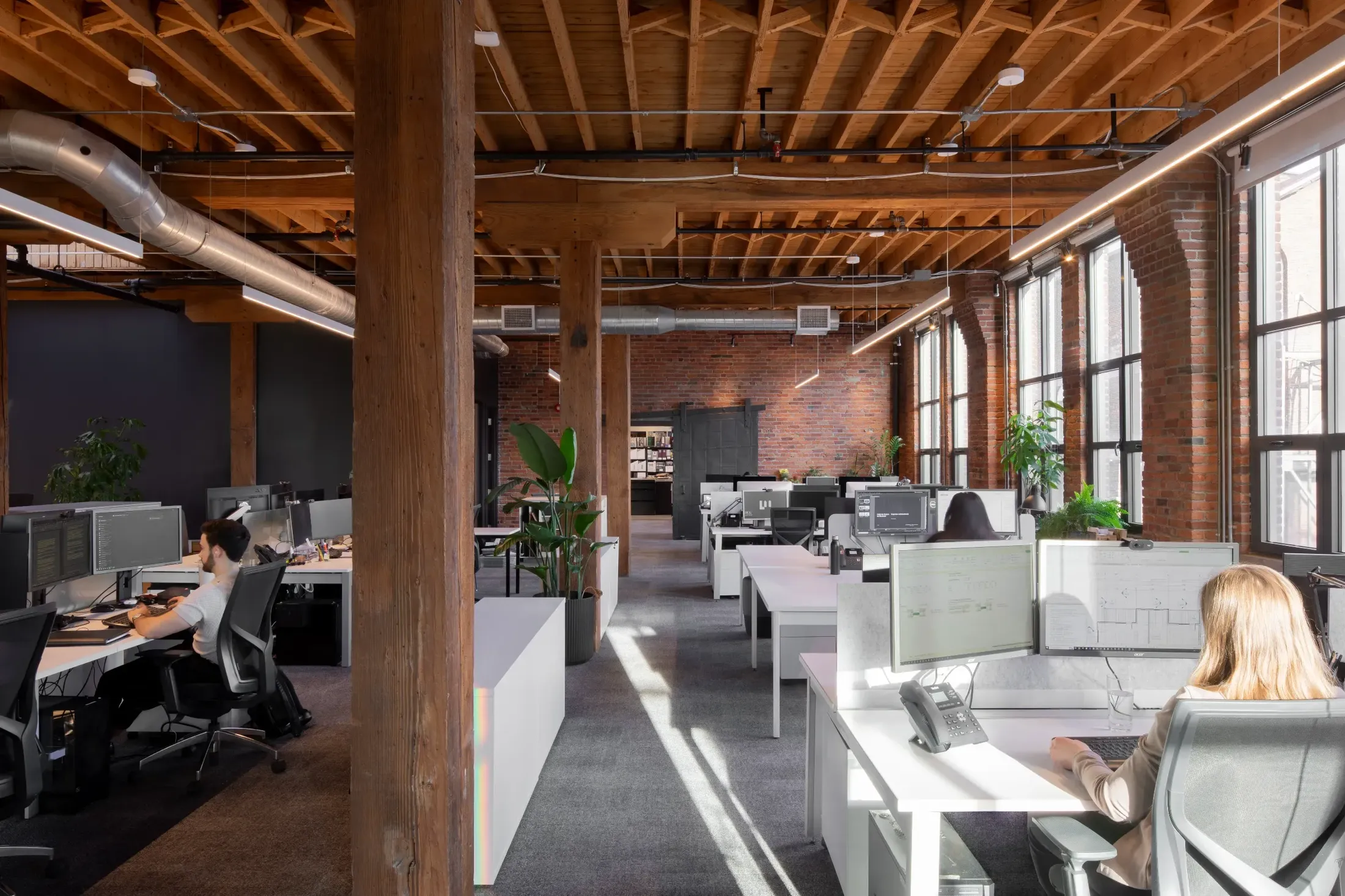 Pour la relocalisation de ses bureaux montréalais, LemayMichaud recherchait un espace évoquant ses anciens locaux, caractérisé par de hauts plafonds, une structure et des murs de briques apparents, ainsi qu’une abondante lumière naturelle — un atout essentiel tant pour le bien-être des employés que pour la création de la matériauthèque. La performance acoustique figurait également parmi les priorités.