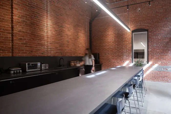 Le bâtiment choisi répondait pleinement à ces critères grâce à ses puits de lumière et à son plancher de béton brut, soigneusement préservé afin de conserver les traces de son histoire. Dès l’entrée, un vaste espace commun, intégrant la cuisine et un grand îlot central, encourage les échanges et la convivialité. Les murs de cet espace sont habillés de feutre pour optimiser l’acoustique.